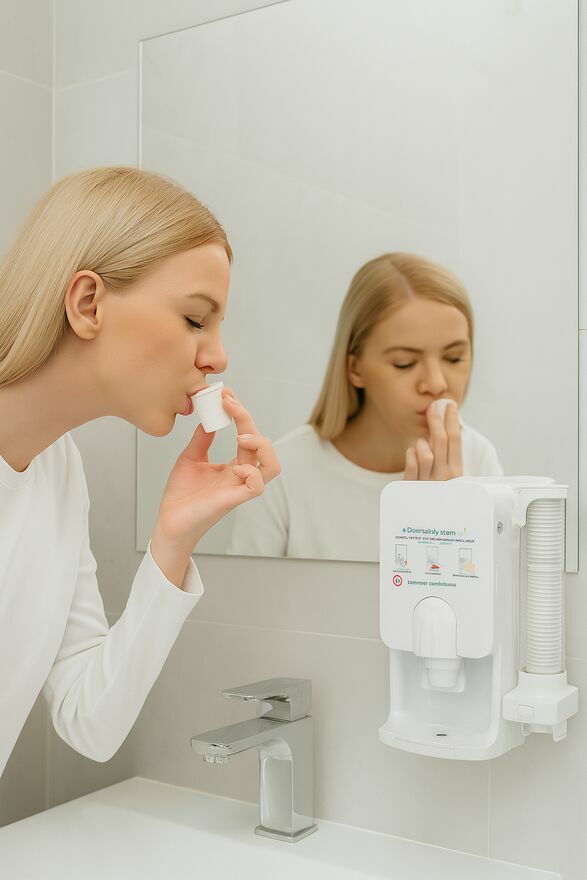 - zawsze łatwy i wygodny dostęp do jednorazowych kubeczków oraz wymiennego płynu, który zapobiega rozwojowi bakterii, wirusów i grzybów, usuwając przy okazji nieprzyjemny zapach z ust, zapewniającego odświeżenie i ochronę antybakteryjną jamy ustnej